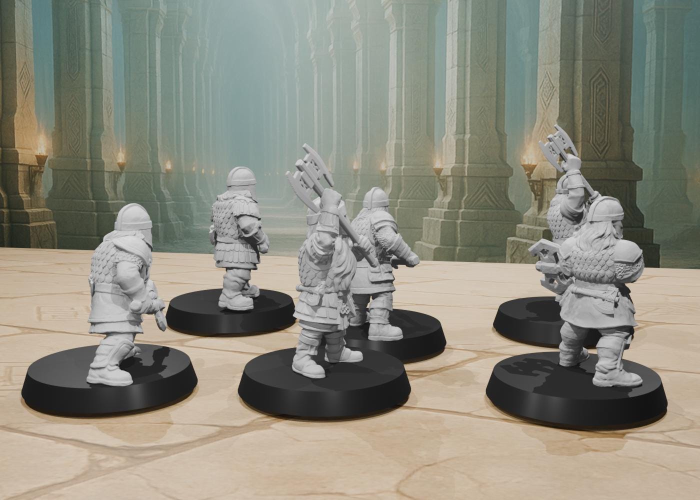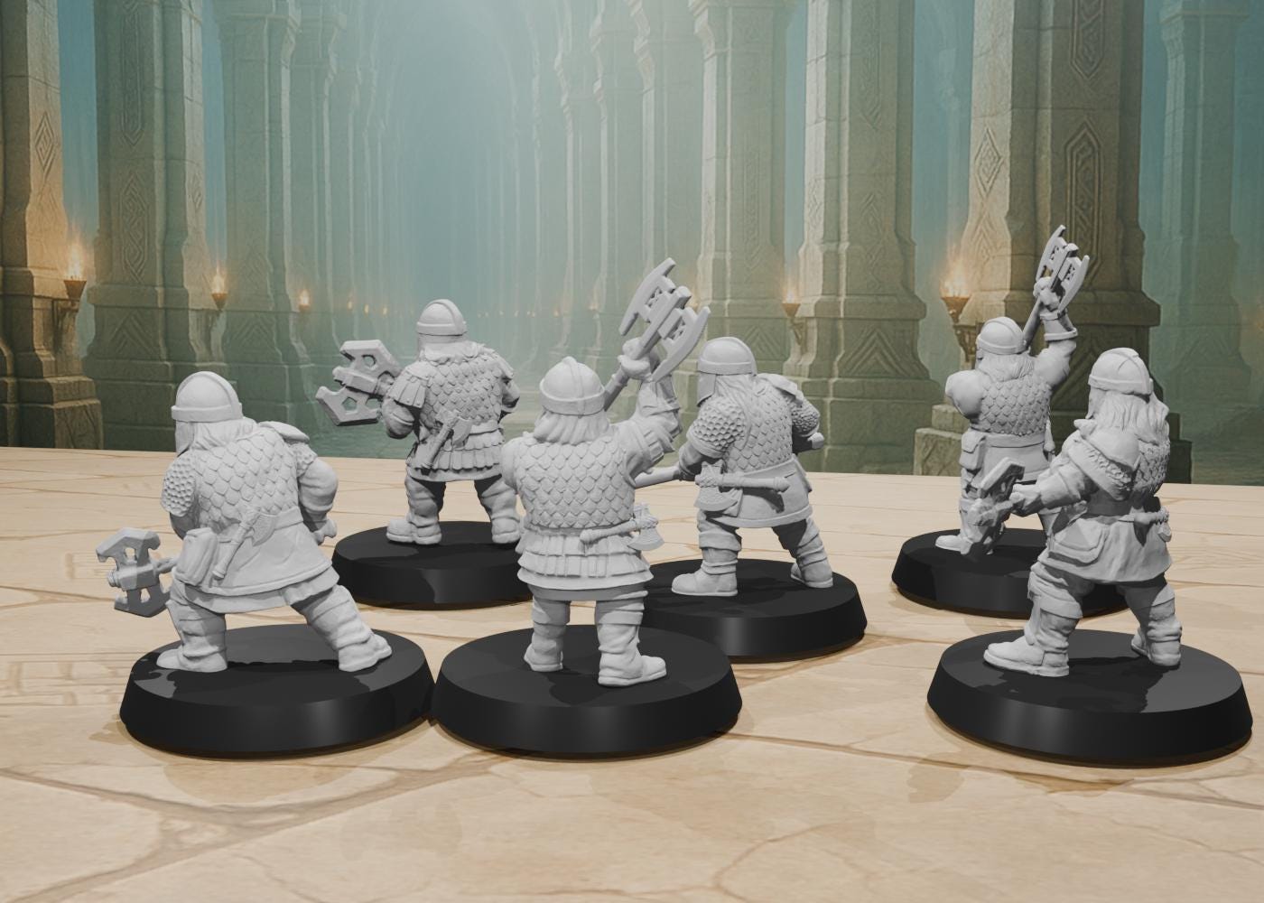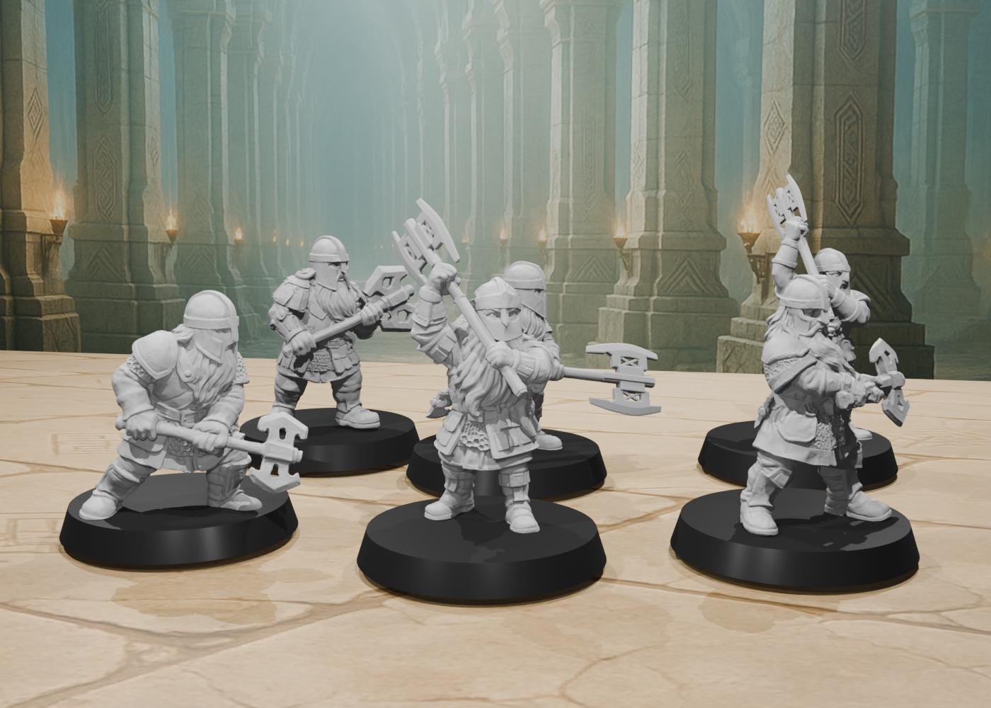 A set of six finely detailed Dwarven Guard miniatures, perfect for tabletop RPGs, skirmish games, and wargaming. Each dwarf is equipped with one- or two-handed axes and printed in high-quality resin for crisp detail and durability.