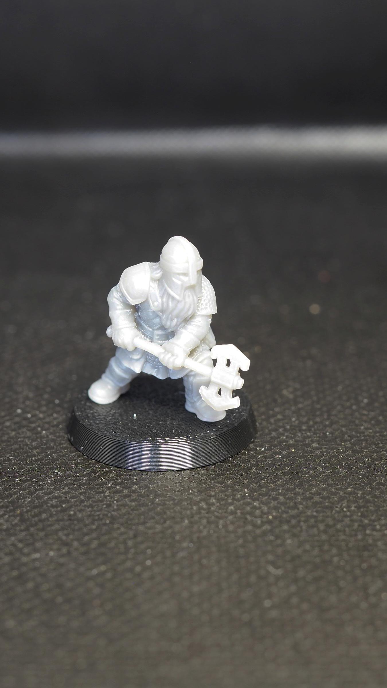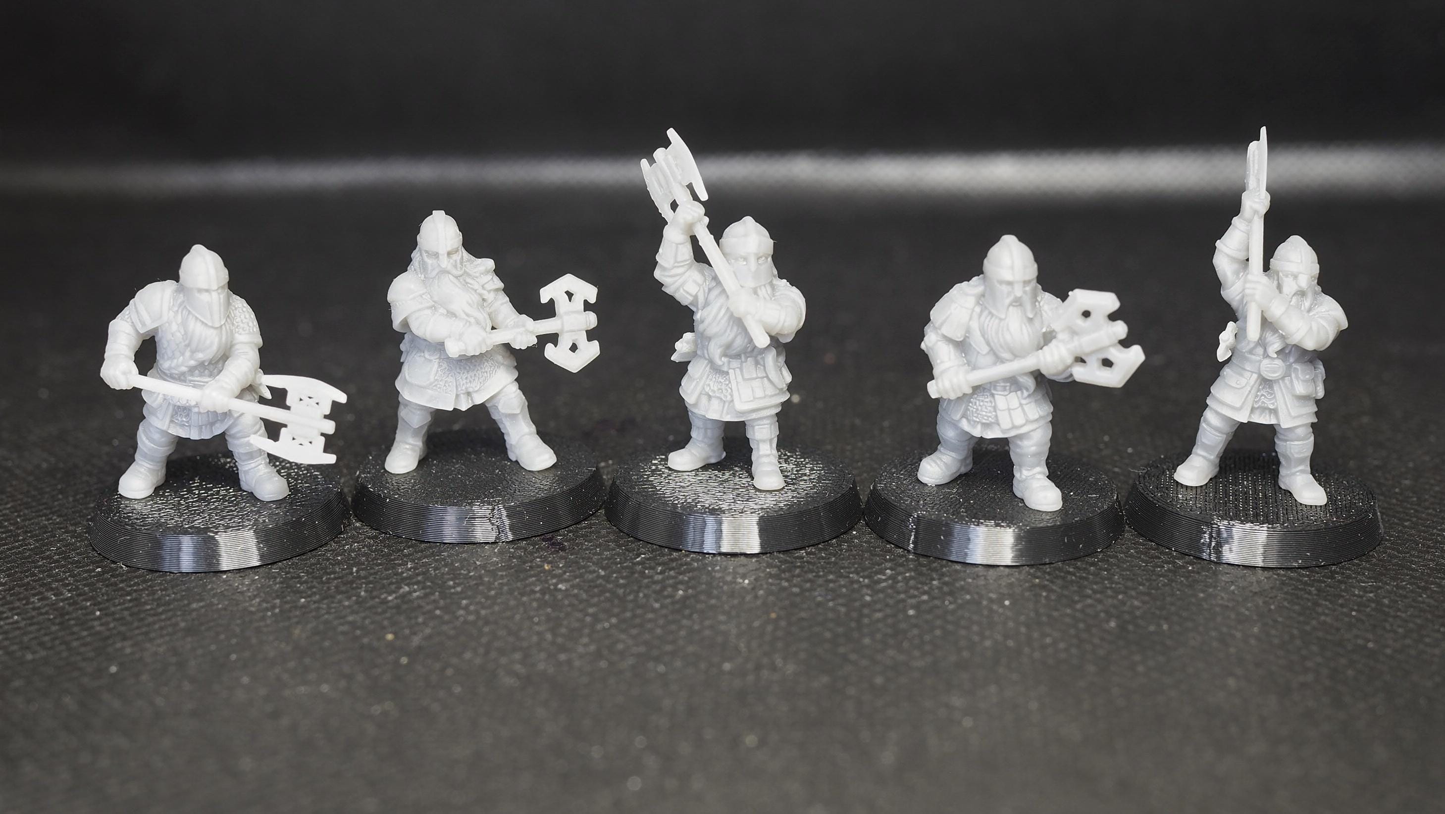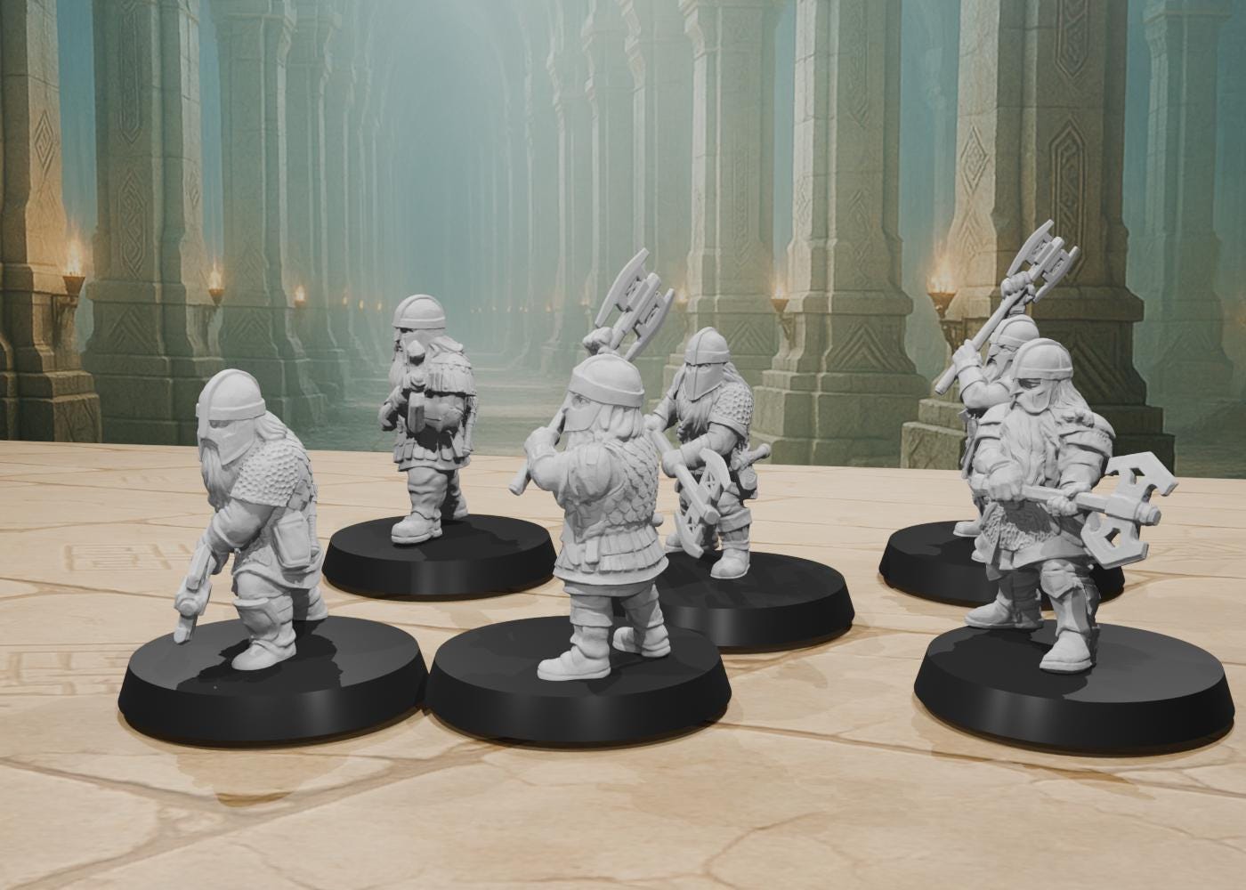 A set of six finely detailed Dwarven Guard miniatures, perfect for tabletop RPGs, skirmish games, and wargaming. Each dwarf is equipped with one- or two-handed axes and printed in high-quality resin for crisp detail and durability.