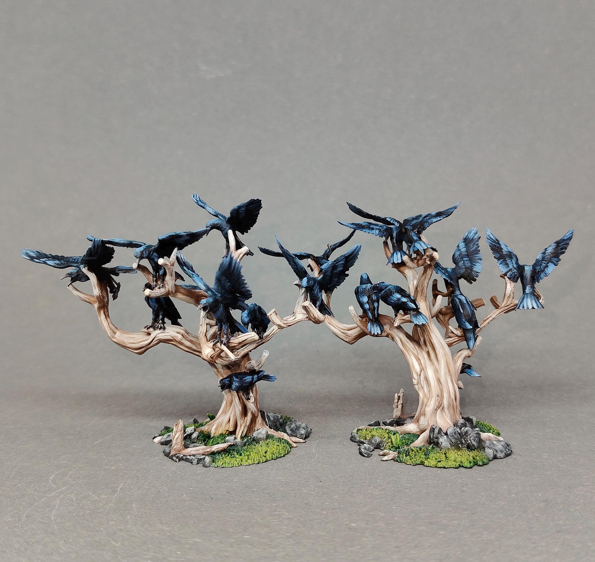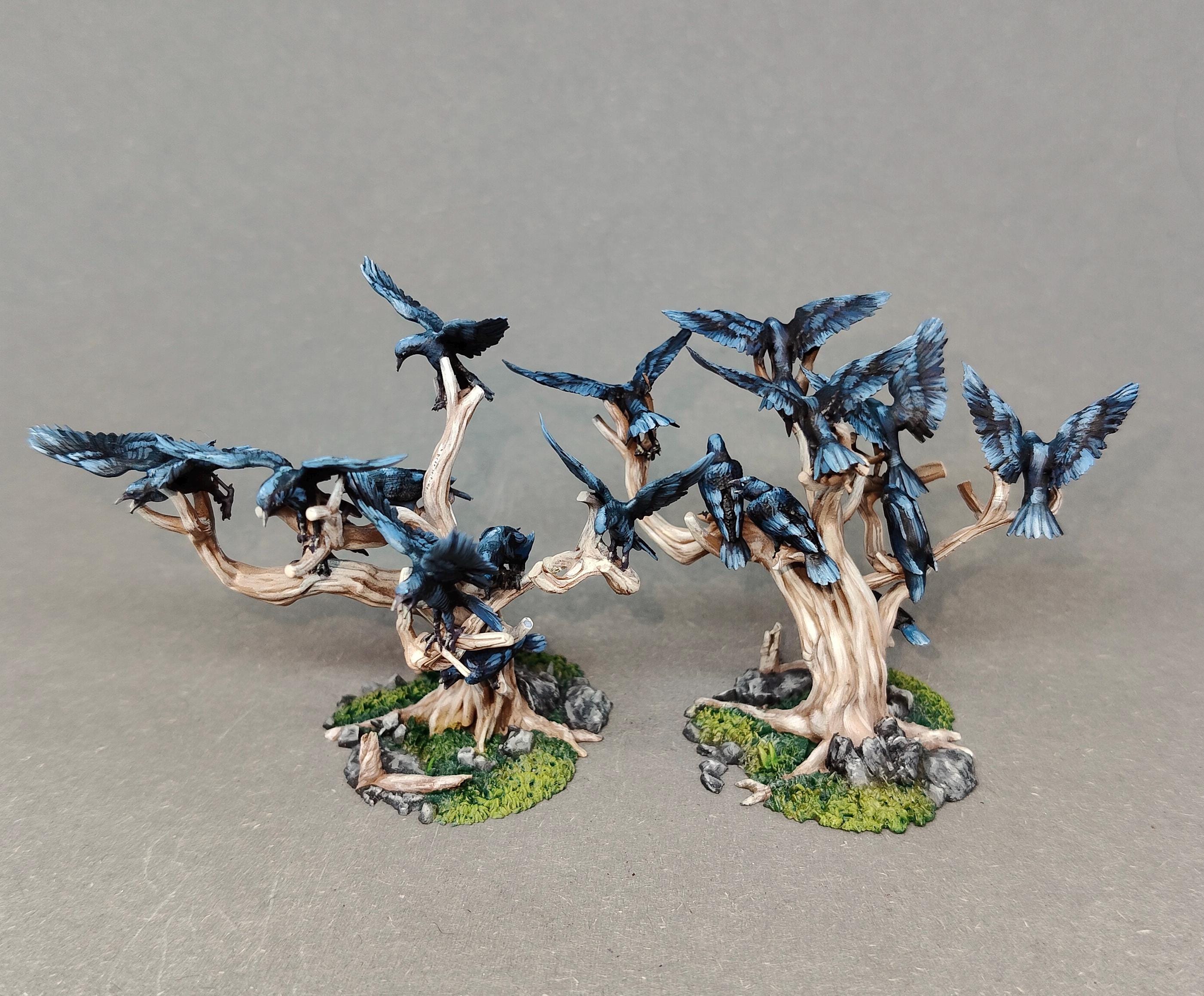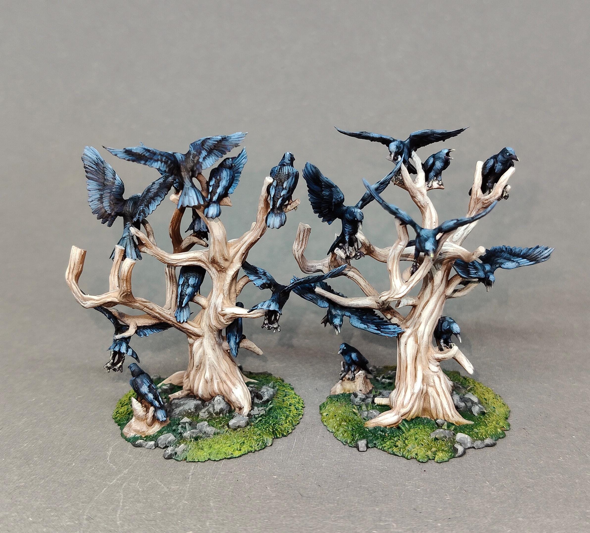 A highly detailed 28mm-scale wargaming set representing the Black Crows, perched and in flight around twisted, lifeless trees.