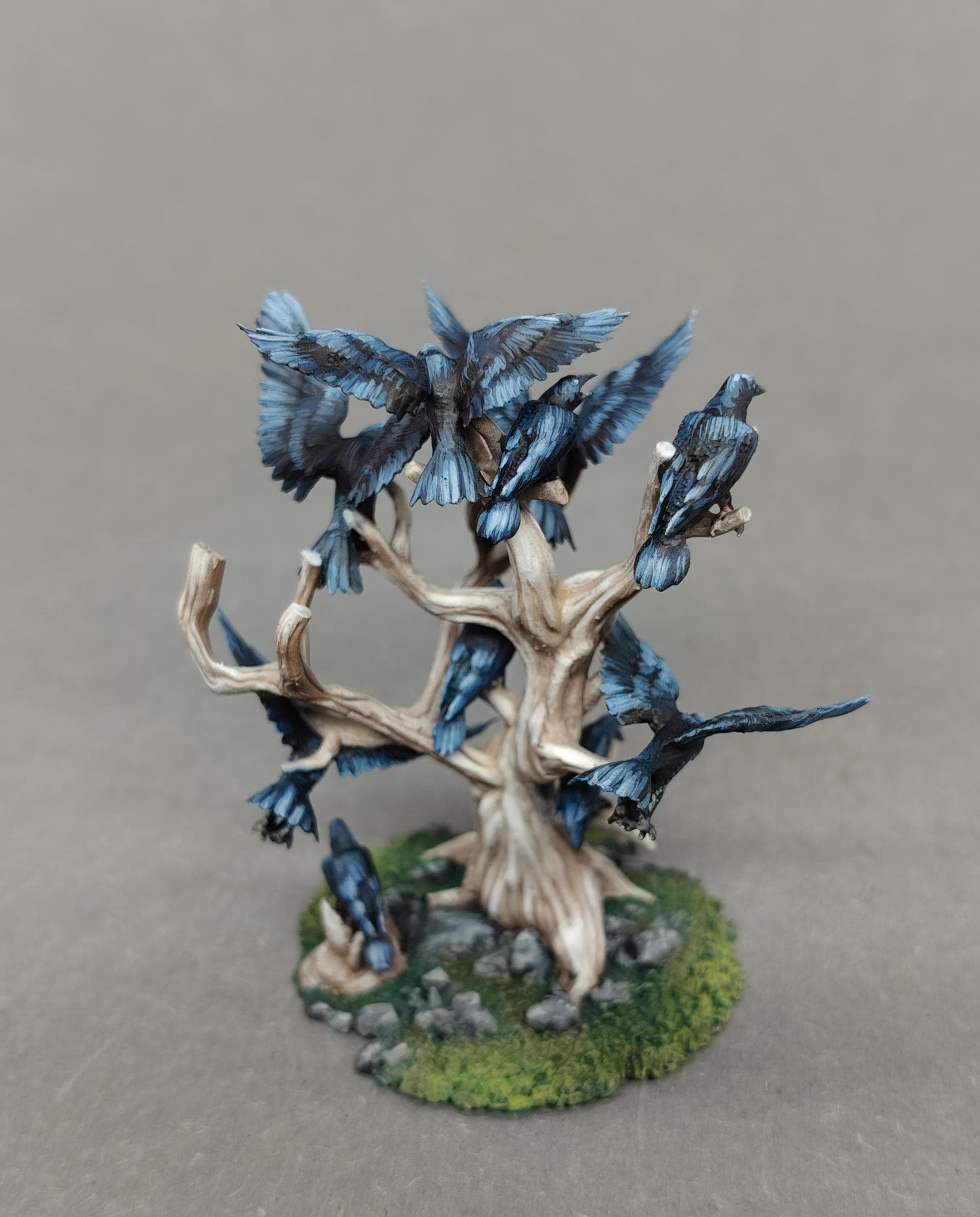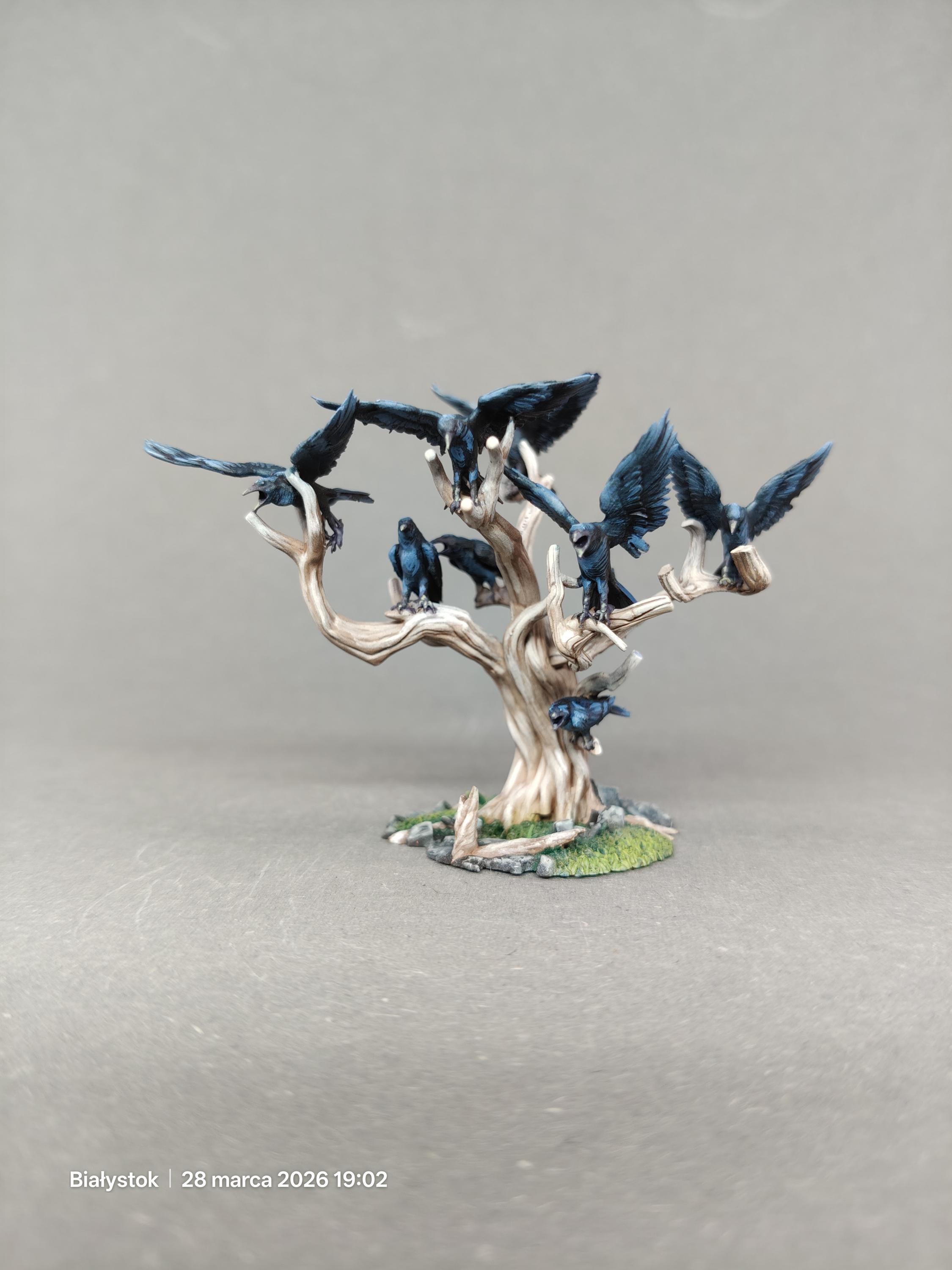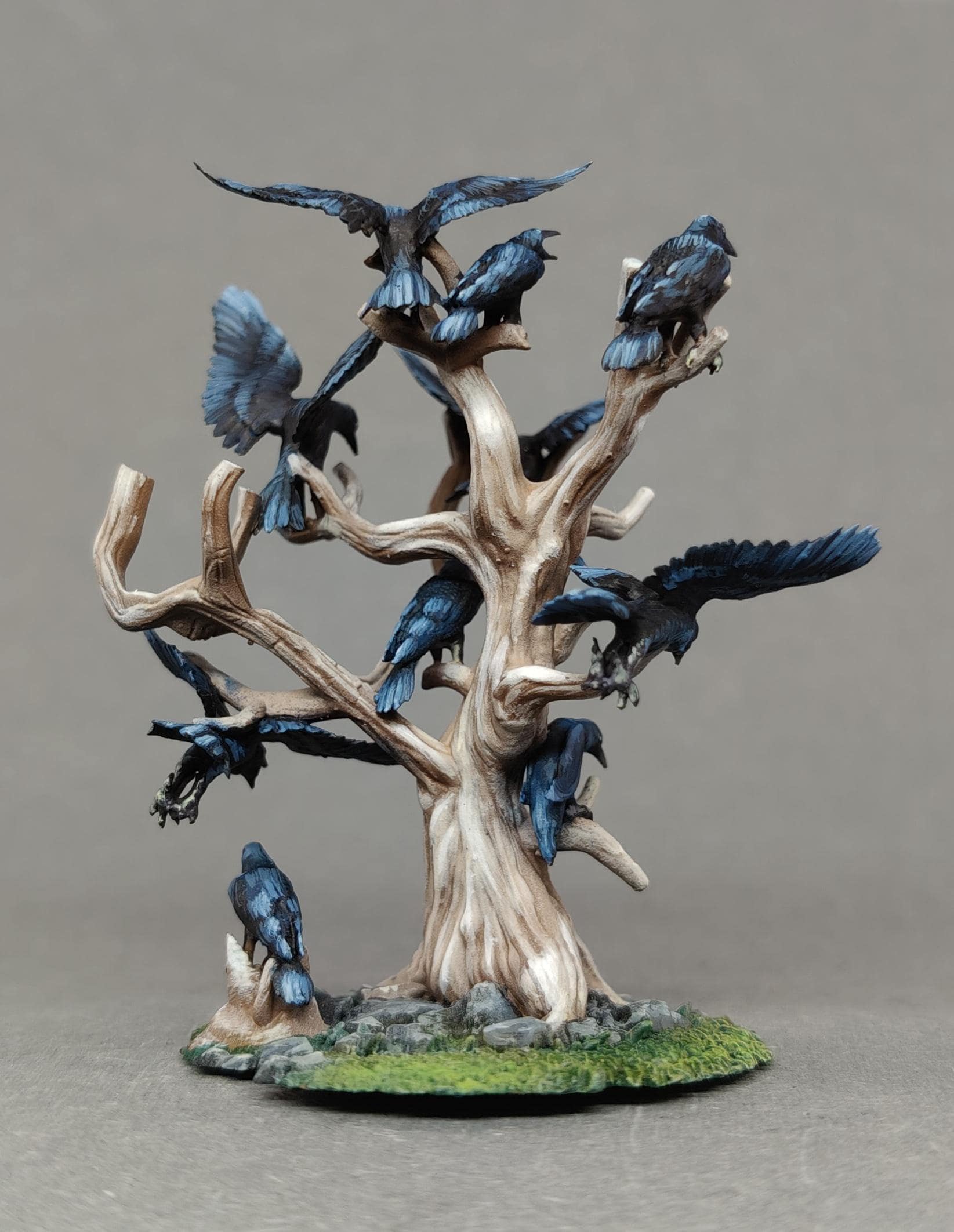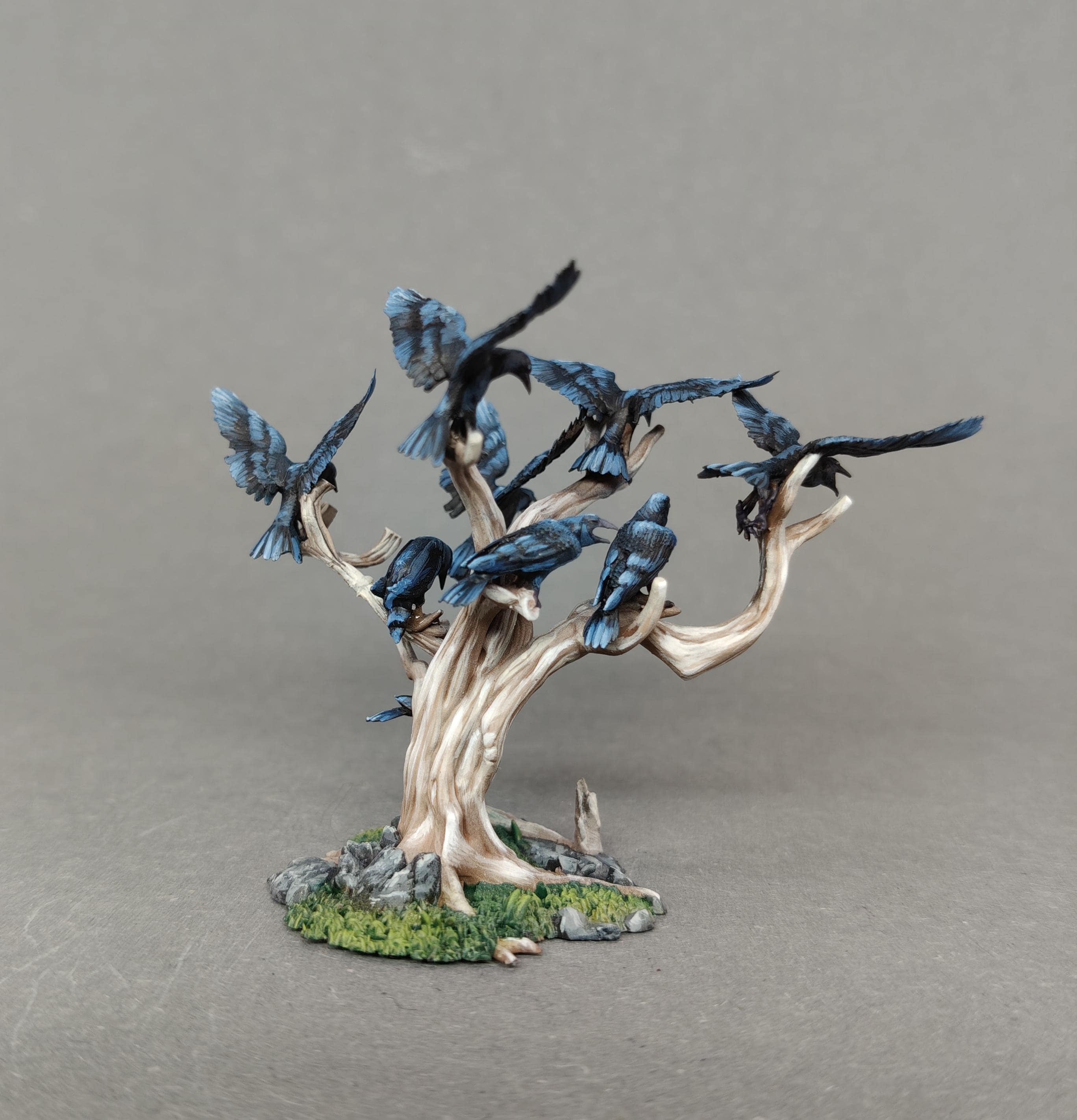 A highly detailed 28mm-scale wargaming set representing the Black Crows, perched and in flight around twisted, lifeless trees.